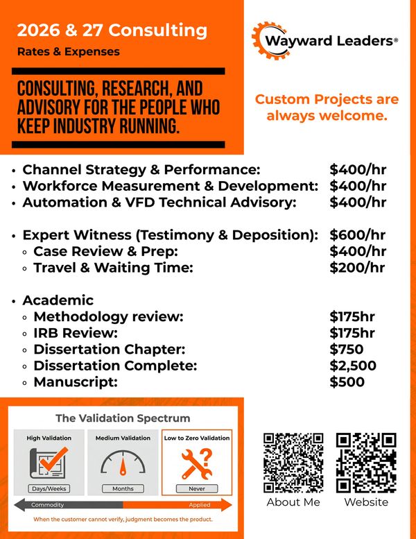 Wayward Leaders provides consulting, advisory, and research services for the industrial automation and distribution industry. Our work is organized around three practice areas. Channel Strategy and Performance helps manufacturers and distributors understand the health of their channel relationships using proprietary frameworks, including the bNPS engagement model and the Brand Report Card, that have been adopted by organizations representing over $20 billion in combined revenue. Workforce Measurement and Development brings research-backed diagnostics to the technical workforce, anchored by the trademarked Specialist Health Index and an IRB-approved study of 430 industrial maintenance workers that identified the conditions under which organizations systematically destroy the grit and perseverance their people already possess. Automation and VFD Technical Advisory draws on 25 years of field application engineering, 750+ drive commissionings, and ABB Drive Expert certification to provide vendor-neutral guidance on specification, commissioning, troubleshooting, and technical support strategy. We also offer expert witness services for industrial equipment disputes, academic and methodological review for researchers and doctoral candidates, and speaking engagements on channel strategy, workforce development, AI governance, and the future of industrial distribution. Every engagement follows the same principle: interpret the data honestly, act on the evidence, and build something that holds.